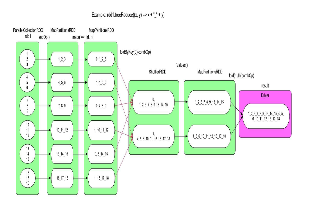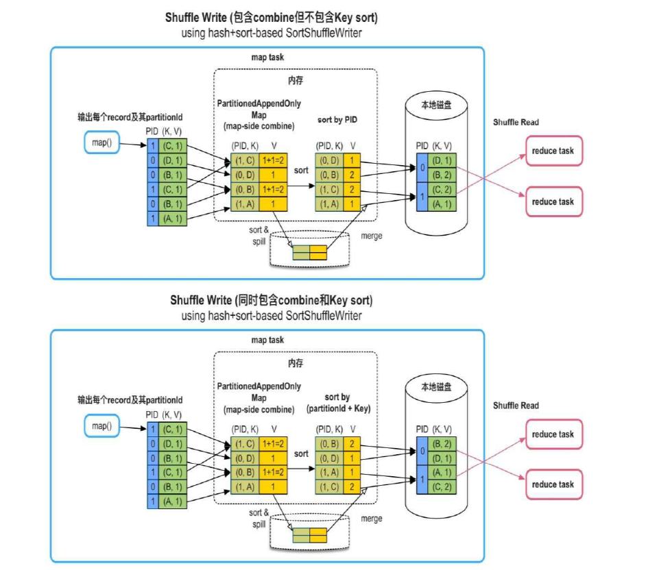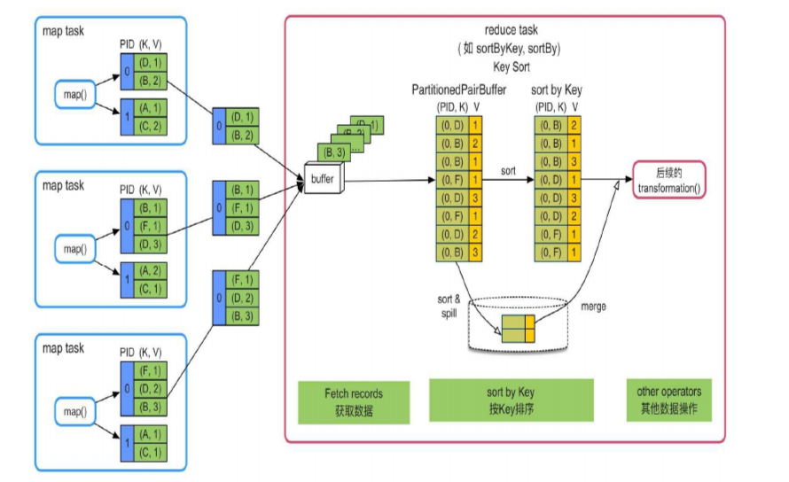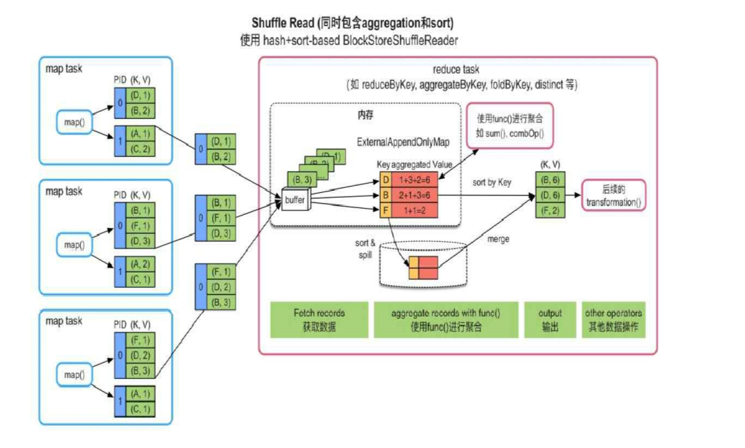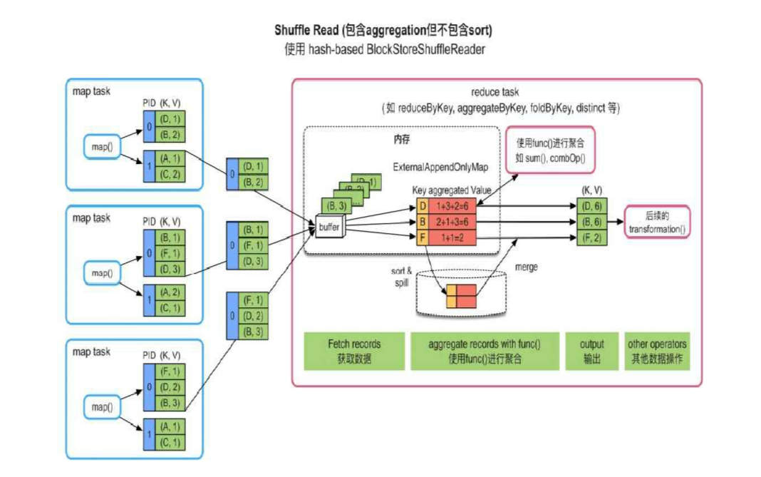 其他的 reduceByKey 也和这个差不多, 唯一区别的就是, 上面说的 Mapside 聚合操作是空, ReduceSide 的聚合操作是 merge, 这里是调用 func