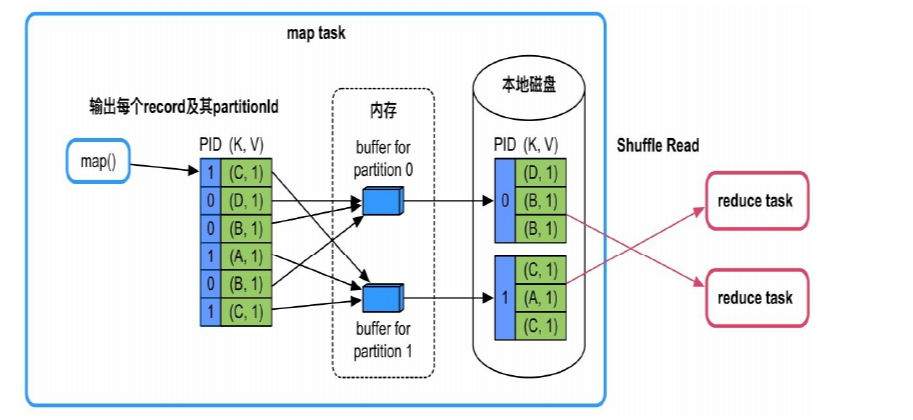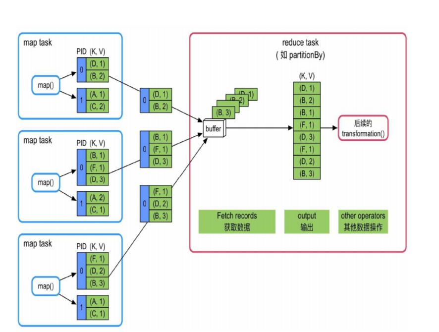 - Hash 分区: 使用record的Hash值来对数据进行划分, 该划分方法经常被用于数据Shuffle阶段