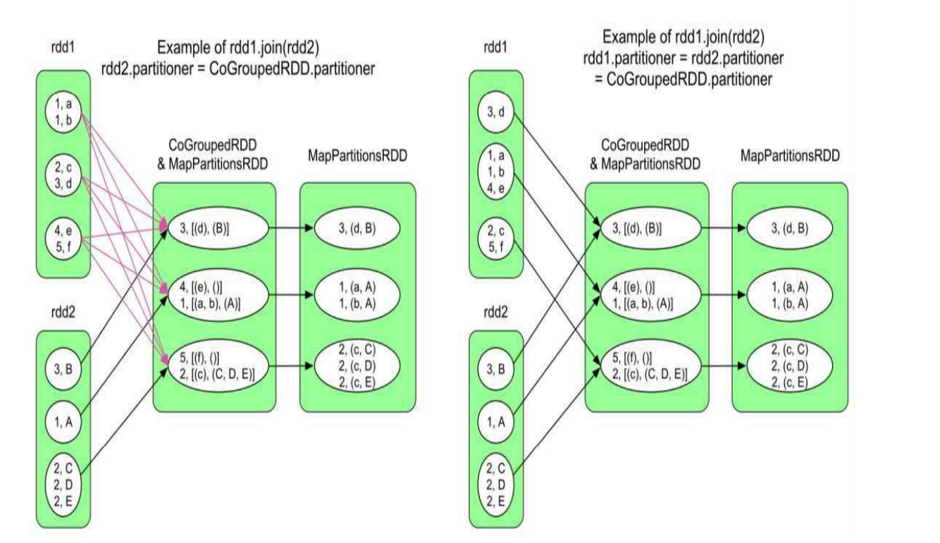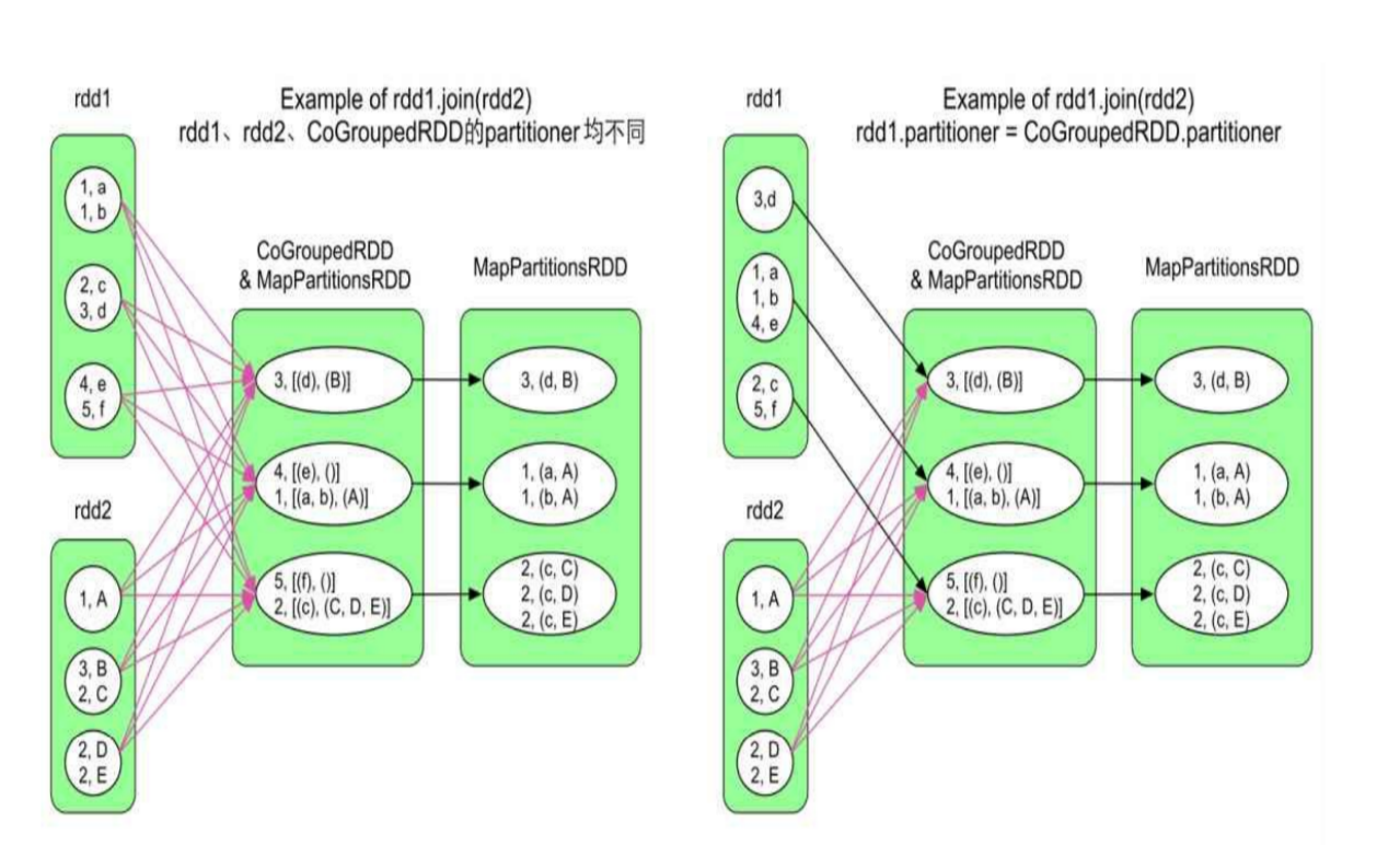 他的计算逻辑是, 先通过 cogroup()/groupWith() 得到一个 (K, List[V], List[W]) 的 RDD, 最后对 List[V], List[W], 进行笛卡尔积